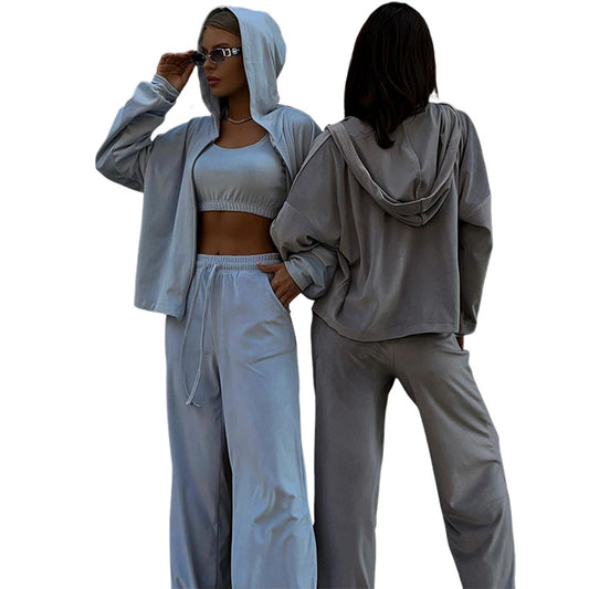 Women's Fashion Temperament Pure Color Hooded Jacket Vest Pants Three-piece Set