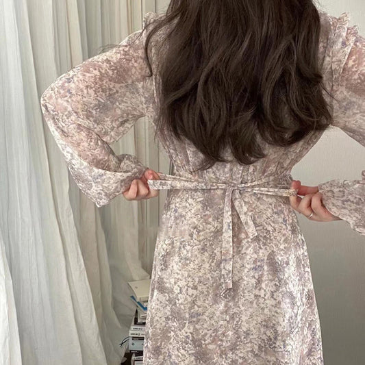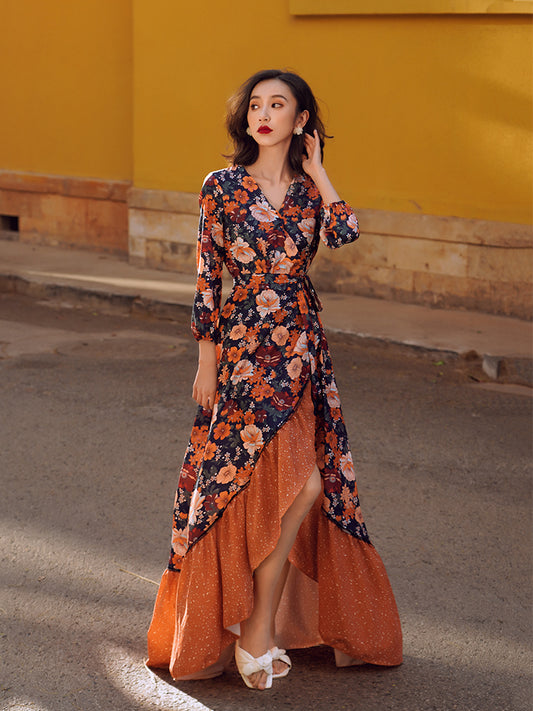 Temperament And Gentle Retro Floral Long Lace-up Dress